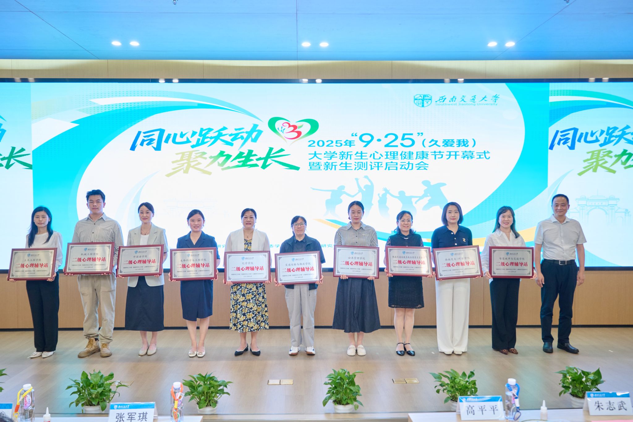 9月26日,西南交通大学2025年“9·25”(久爱我)大学新生心理健康节启动仪式暨新生测评动员大会在犀浦校区举行。校党委副书记高平平出席仪式,并为全校10个二级心理辅导站试点建设单位授牌,化学学院“化语心声”心理辅导站成功入选,标志着学院心理健康教育工作正式迈入“专业化、特色化、体系化”建设新阶段。