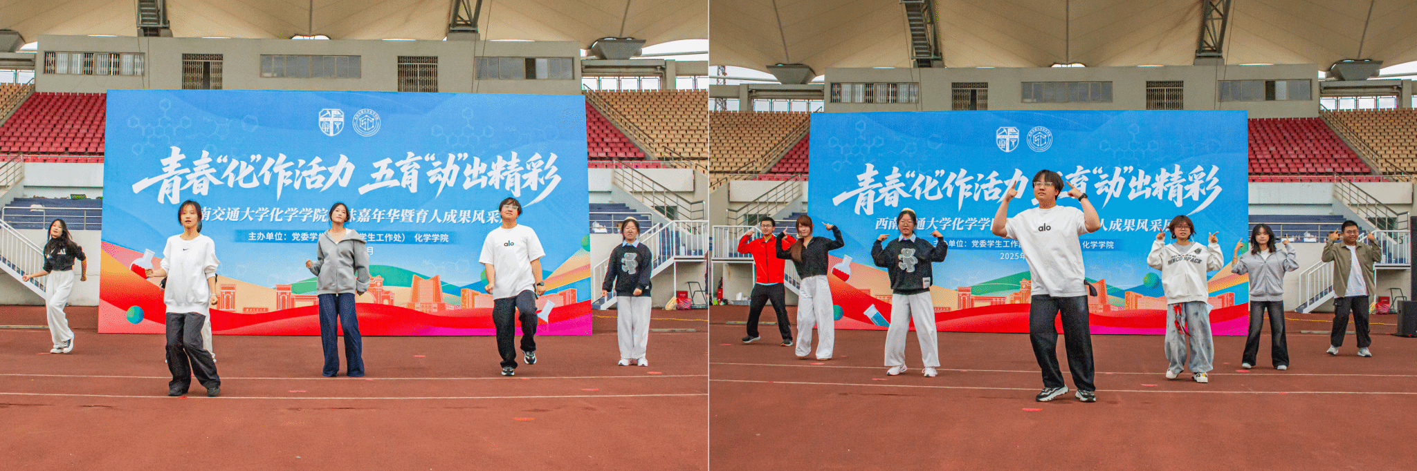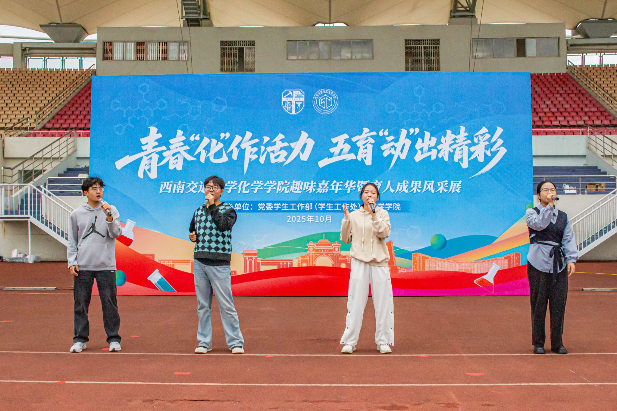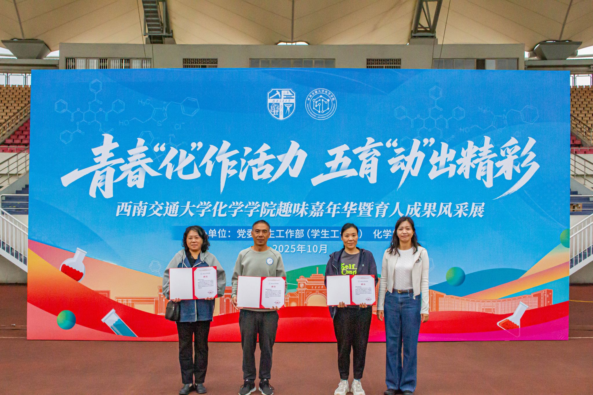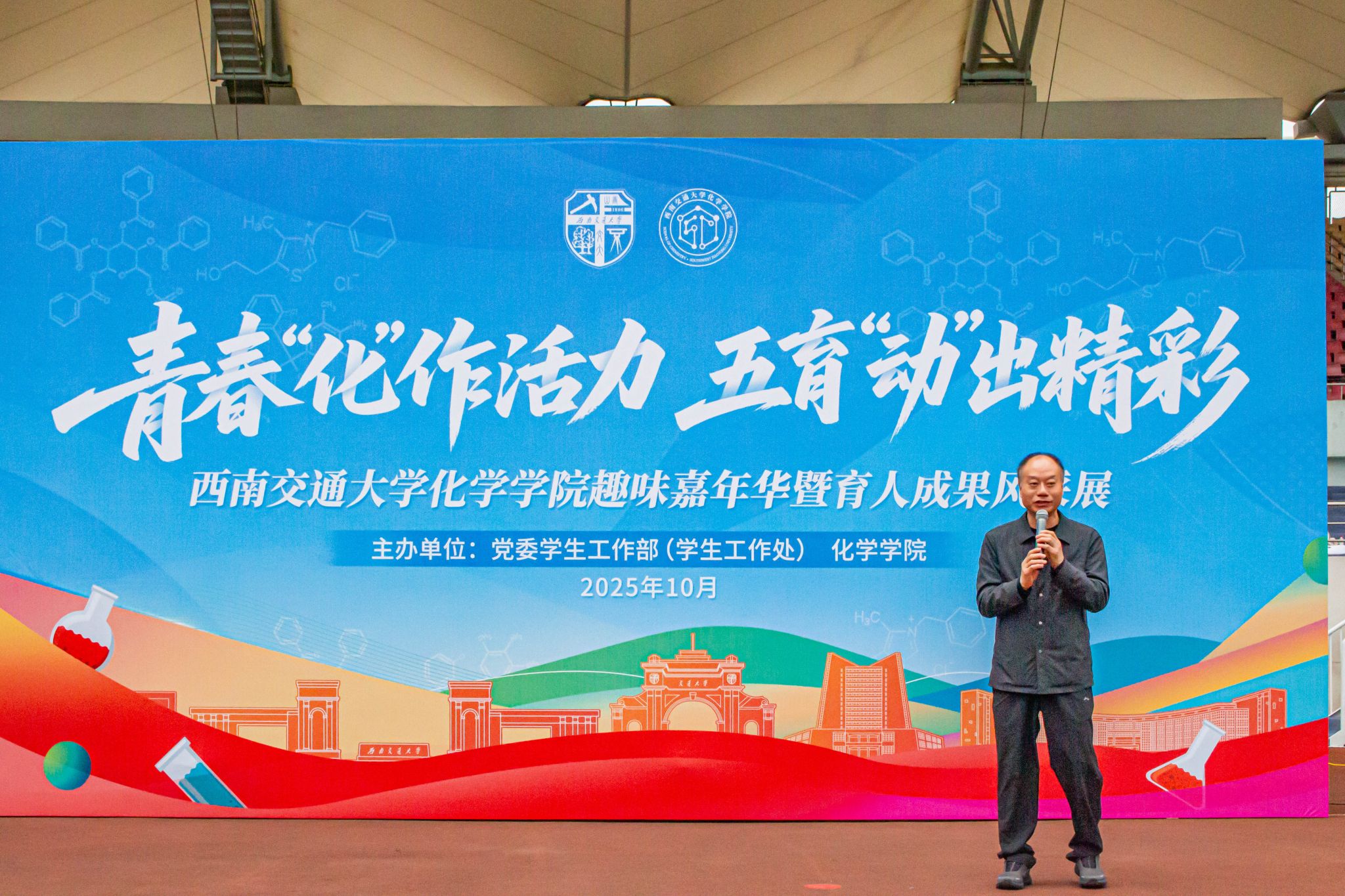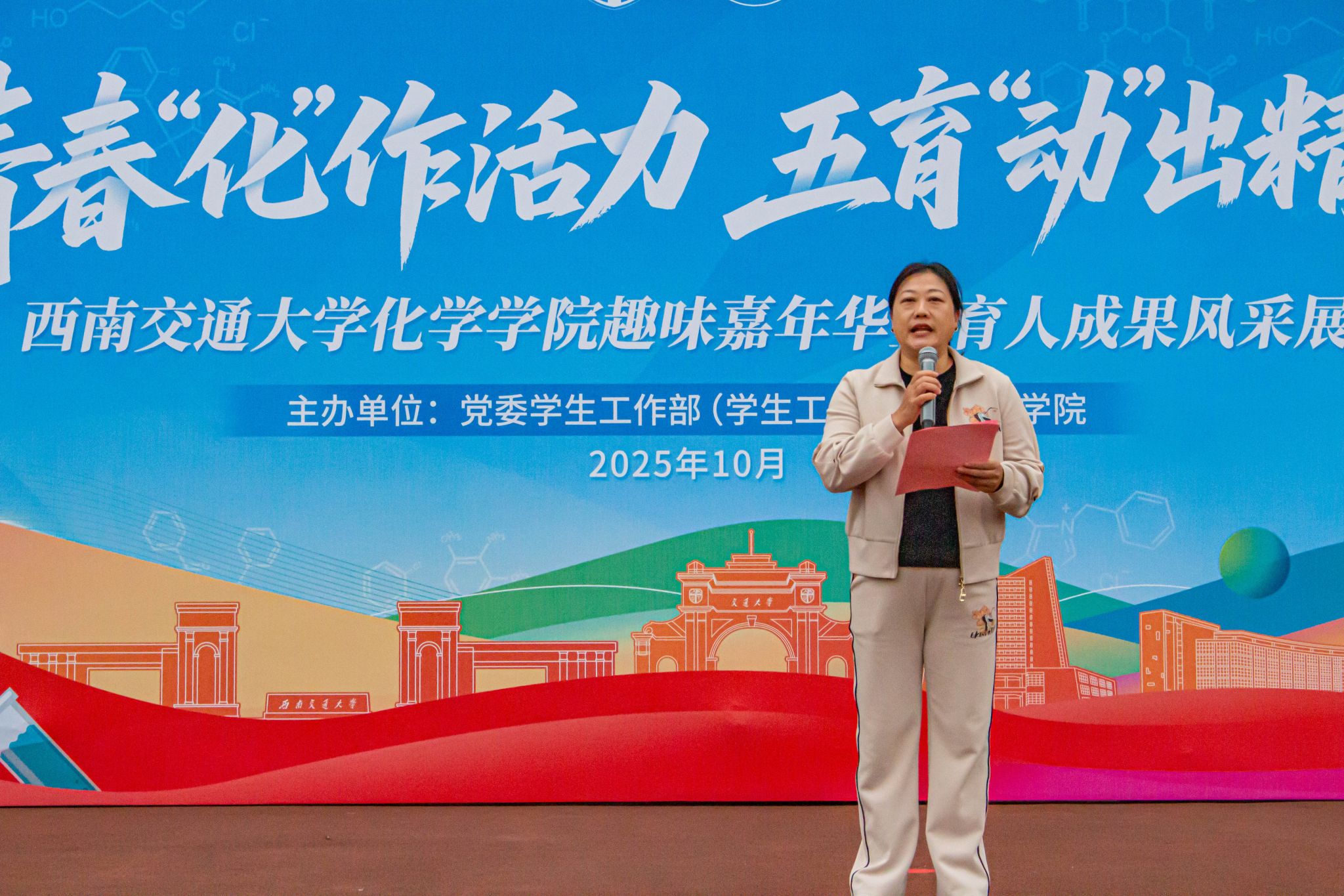 为献礼西南交通大学130周年校庆,进一步丰富师生校园文化生活,深度践行学校“融通共育”工作安排,10月18日上午,由党委学生工作部(学生工作处)、化学学院主办,化学学院学工组、工会、团委共同承办的“青春‘化’作活力·五育‘动’出精彩——趣味嘉年华暨育人成果风采展”在犀浦校区北区体育场精彩举办。化学学院院长周祚万,党委学生工作部副部长谢力,学院体育导师郭海阳,美育导师张娟霞,心理导师张学伟,党委副书记张春燕,副院长、工会主席王雅雯,院务委员刘睿颖,以及学院200余名师生齐聚于此,在运动竞技中凝聚团队力量,在特色体验中感受化学学科魅力,在互动交流中践行“五育并举”理念,共同打造了一场兼具学科特色与育人温度的青春盛会。