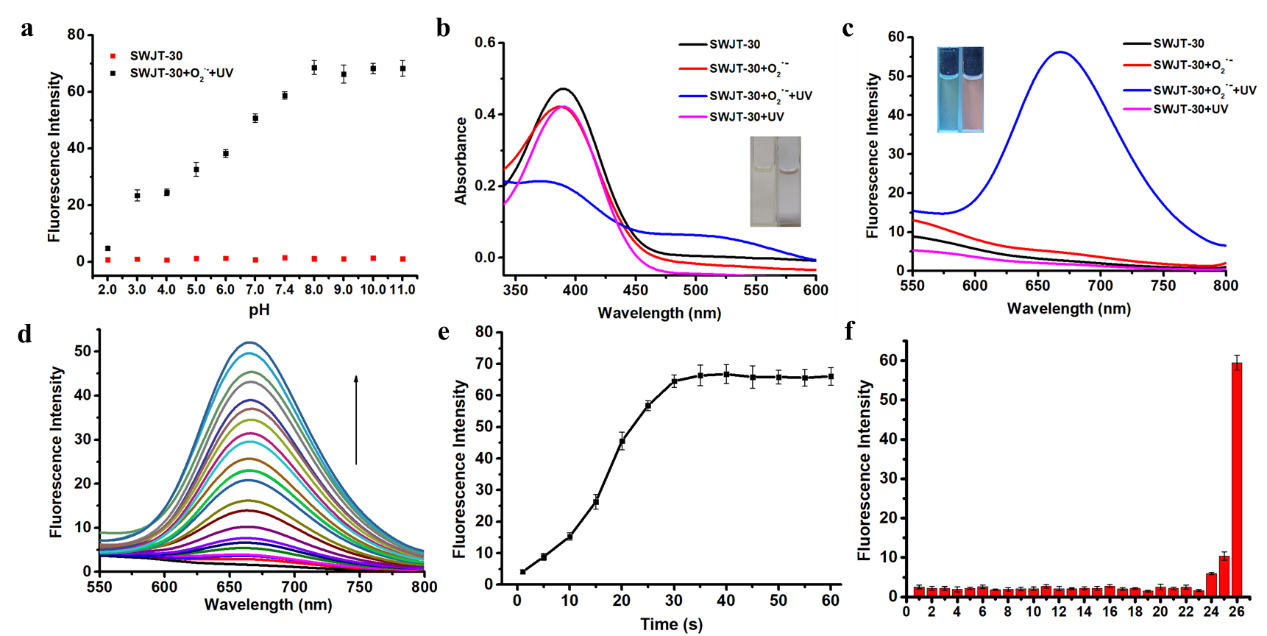 在这项工作中,作者开发了一种基于磺酸酯识别基团的新型光辅助激活荧光探针。该探针仅在紫外线(UV)和超氧阴离子(O2•‒)同时存在时才会产生荧光信号。这种双重识别机制确保了荧光信号的精确可控性,同时保持了高特异性和最快的反应动力学(<30 s)。基于这一设计,构建了一种线粒体靶向和血脑屏障穿透探针(SWJT-30),用于时间可控地检测脑缺血再灌注损伤(CIRI)中的活性氧波动。通过这项研究,作者不仅阐明了铜死亡在CIRI中的作用,还证明了光辅助激活探针在不同病理和生理背景下进行时空控制成像的广泛潜力。