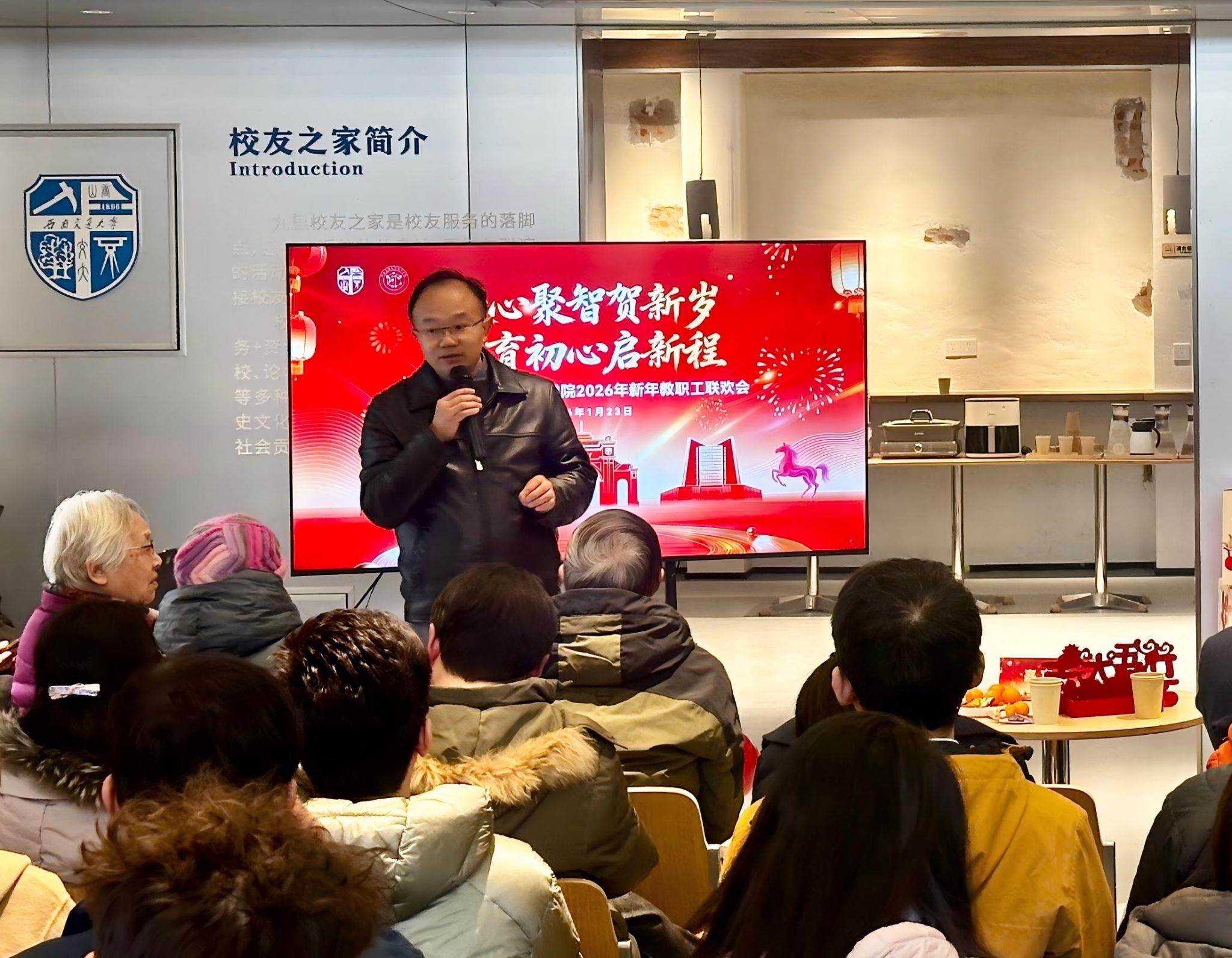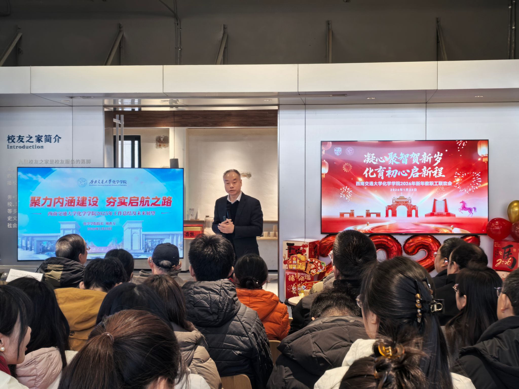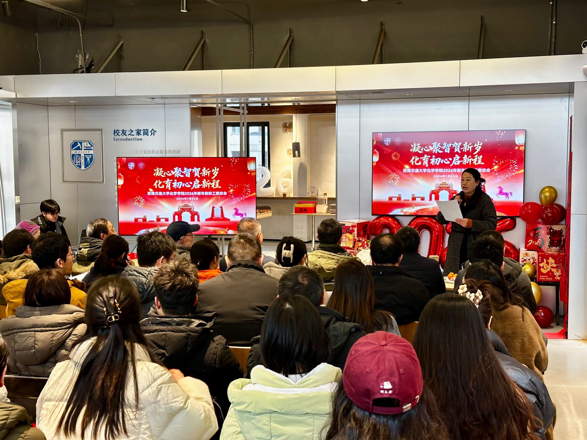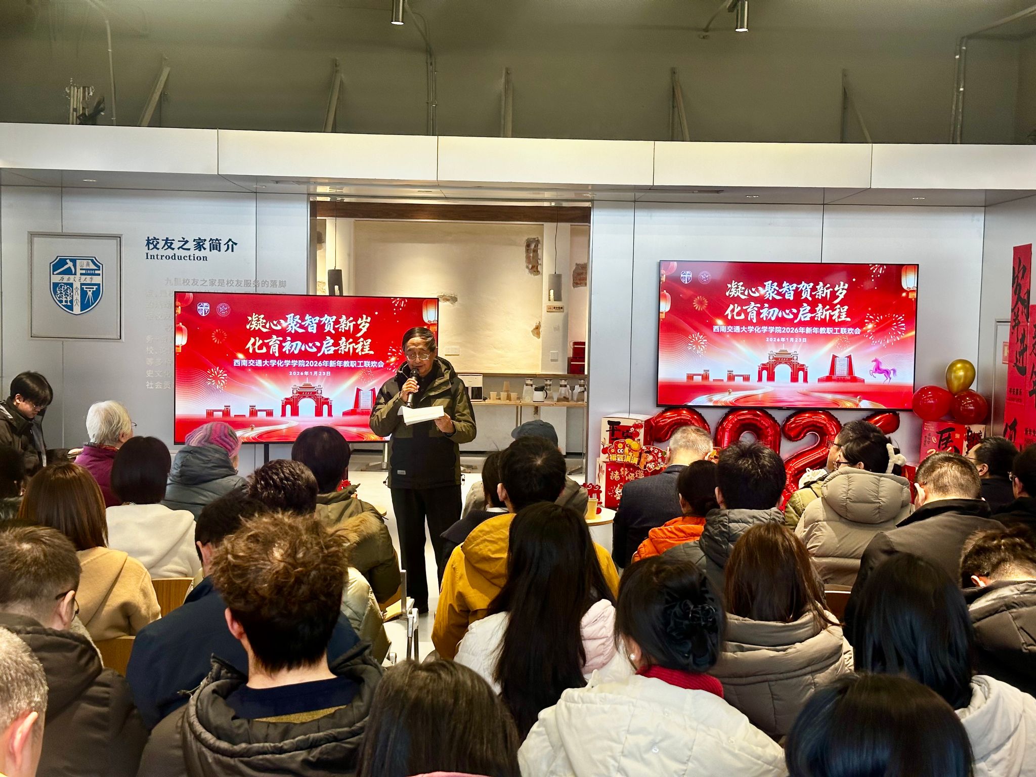 2026年1月23日下午,化学学院“凝心聚智贺新岁·化育初心启新程”新年教职工联欢会在九里校区校友之家温馨举行。学院党政领导班子、全体教职工、退休老教师代表及多位特邀嘉宾齐聚一堂,共叙师者情谊,共话学院发展,在欢声笑语中迎接马年新春的到来。