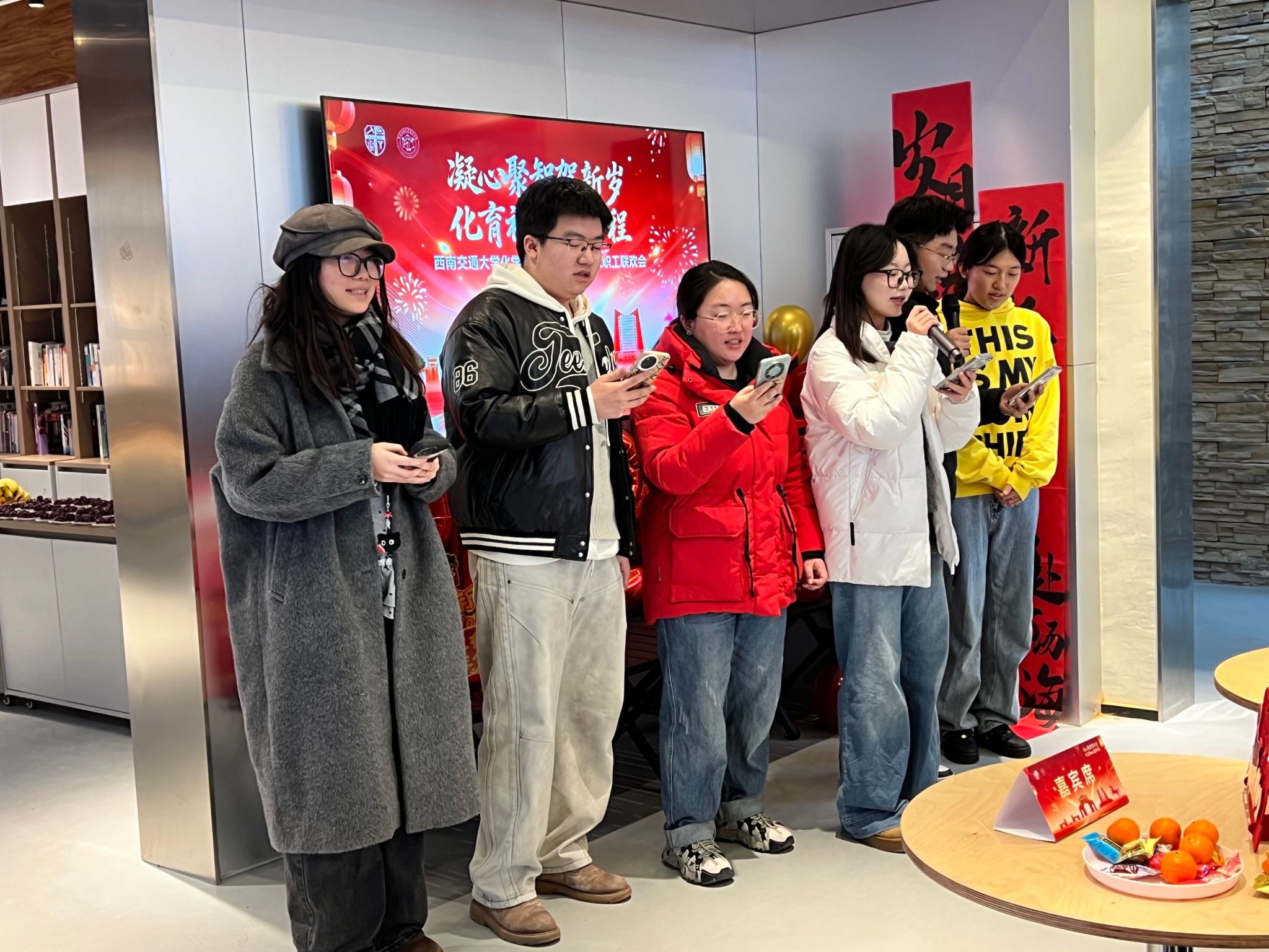 联欢会尾声,学院全体领导班子走上台前,向全院教师送上最真挚的新年祝福,愿大家在新的一年里工作顺遂、岁月安康,与学院携手共赴新程。年轻的辅导员队伍与学生代表共同合唱《我的未来式》,激昂的旋律、奋进的歌词传递出团结向上的正能量,传递给了在场的每一位老师。