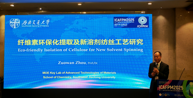 西南交通大学化学学院周祚万教授应邀在“绿色可持续发展论坛”上作题为“天然纤维素环保化提取和新溶剂纺丝工艺研究”的主题报告(Keynote Speech),系统报告了团队在天然纤维素绿色提取技术、新型溶剂纺丝工艺和相关领域方面的研究进展,受到与会专家的广泛关注和热烈讨论。会后,多位专家学者以及中国纺织工业联合会、中国化学学会高级专员与周教授进行了深入交流,探讨了相关技术的前景与推广应用途径。我校功能高分子材料团队的博士生李兴珍和张贺也一同参加了会议,并积极参与了学术交流与研讨;周祚万教授还应邀出席相关学术交流活动,并主持论坛报告会。