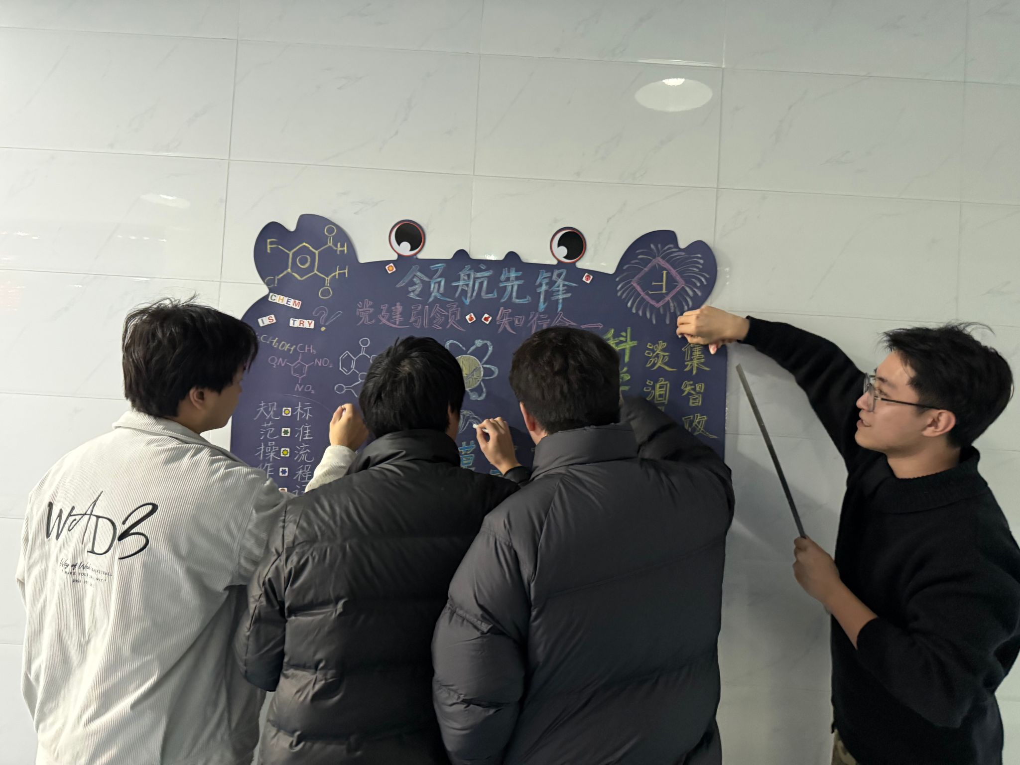 深度融合 “党建 + 社会服务” 理念,依托化学专业知识优势,组织党员系统学习生态监测、科普支教、危险化学品安全宣传等实用内容。党员们发挥专业所长,将复杂理论转化为通俗易懂的知识要点,通过主题板报呈现服务核心内容。