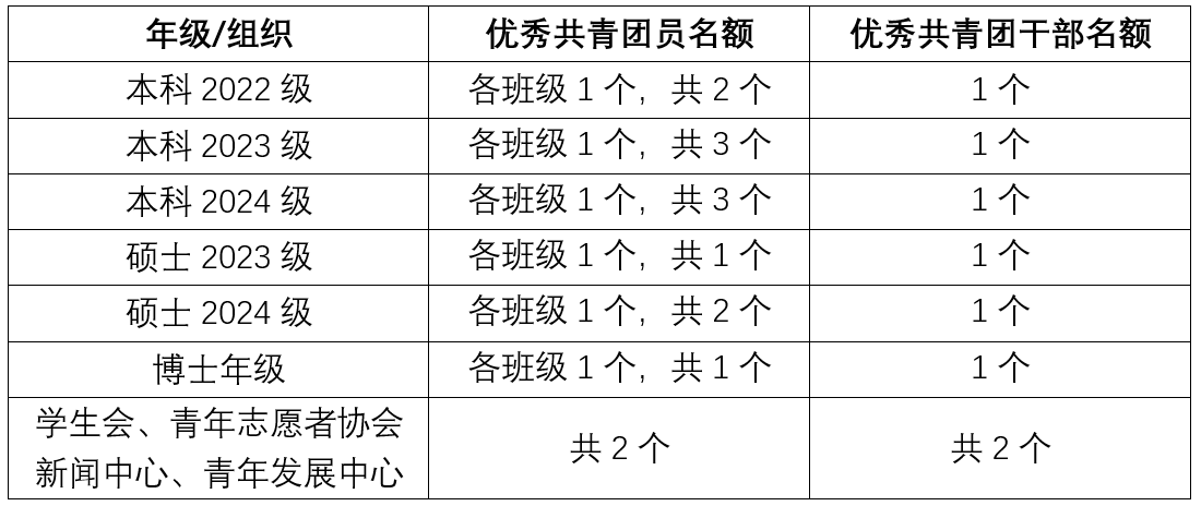 特别说明:4个学生组织可最终推荐2名优秀共青团员、2名优秀共青团干部,由学生组织指导老师牵头完成,推荐人员不参与团支部推荐,且不占用各团支部、各年级指标。