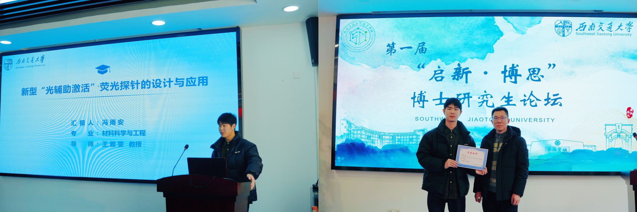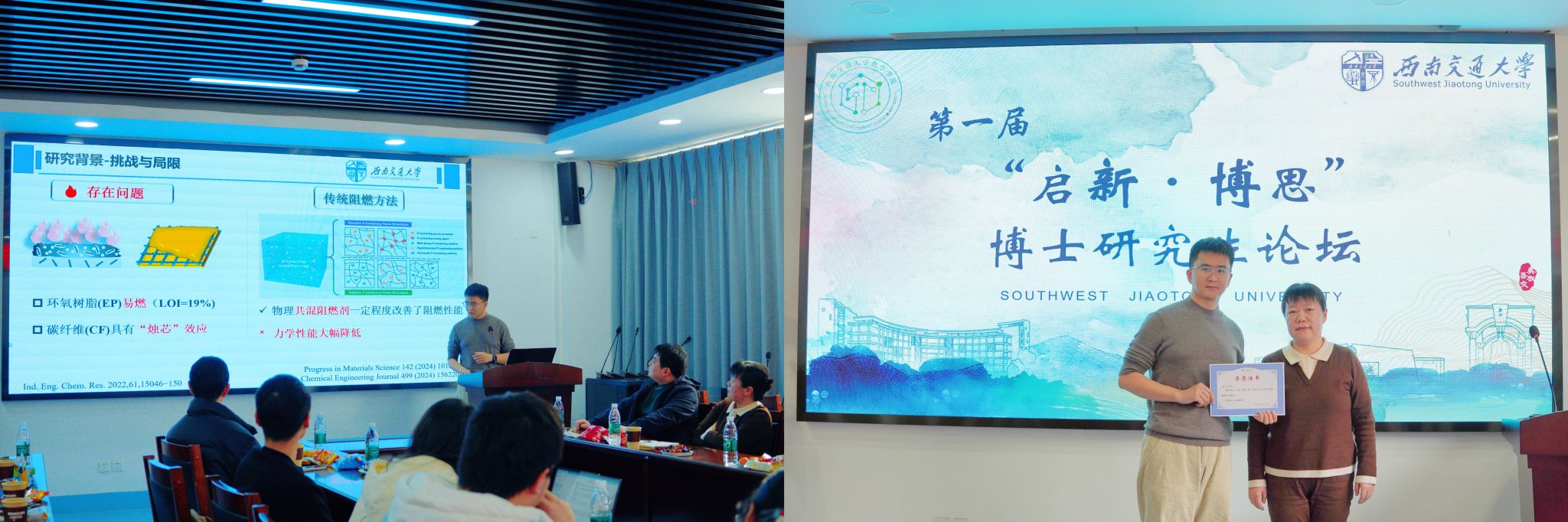 新年伊始,为搭建高层次学术交流平台、激发研究生科研创新活力、提升学子学术素养与科研能力,2026年1月8日,西南交通大学化学学院第一届“启新·博思”博士生论坛在九里校区科技工业园C203会议室顺利举办。学院党委副书记柯小君、副院长王勇、副院长王雅雯、团委书记孔维东出席,多名博士研究生参与研讨,论坛由学院研究生会主席姚思辰博士生主持。本次论坛由化学学院主办,学院研究生会承办开展。