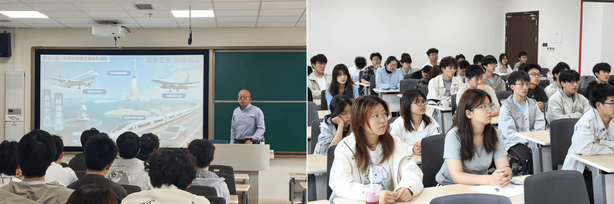 随后,白教授结合自身科研经历与团队建设成果,向同学们系统介绍了高性能弹性体材料团队的研究布局、核心方向与发展愿景。他指出,团队紧扣国家海、陆、空、天领域关键高分子基础原材料自主可控需求,聚焦高性能合成橡胶精准合成、多尺度结构及动力学调控,重点攻关轨道交通密封材料、特种轮胎材料等“卡脖子”技术,多项技术实现从0到1的突破。白教授还详细讲解了团队在轨道交通密封、航空轮胎、深海密封、超低温材料等方向的研究进展,分享了从基础研究到工程化、产业化的全链条创新经验,鼓励同学们立足专业、勇于探索,把个人成长融入国家重大需求。
